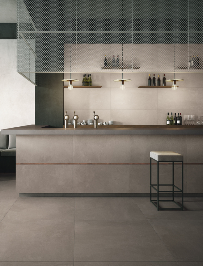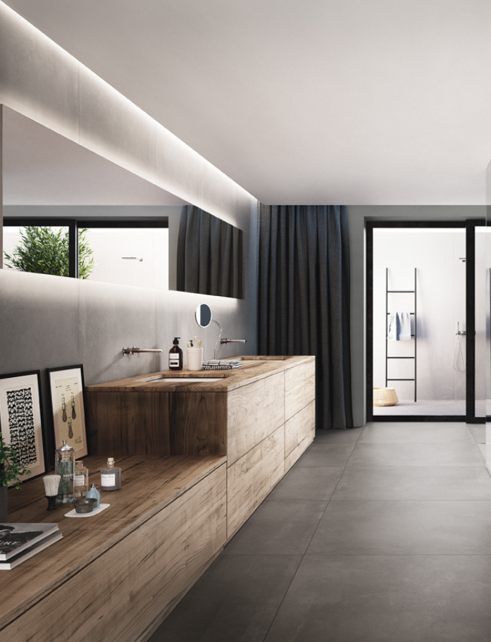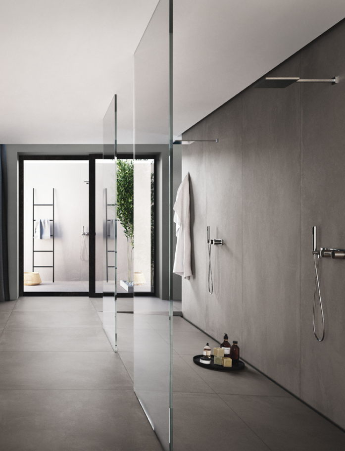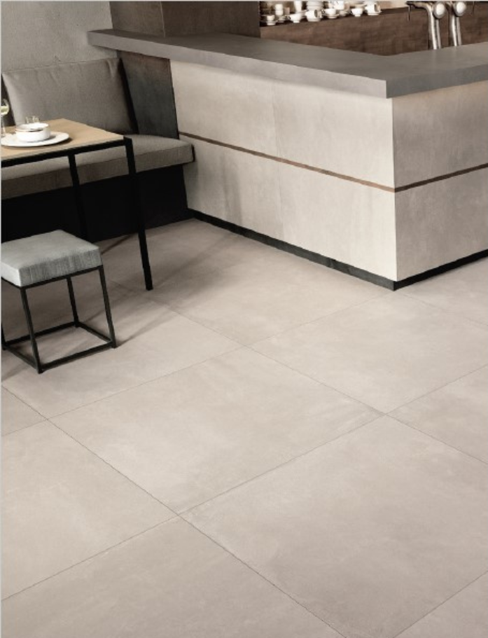 Subtle grey washes flow seamlessly across large-format tiles, creating expanses of calm that ground both interior and exterior spaces in quiet sophistication. This is minimalism with soul: clean lines that breathe, industrial aesthetics softened by thoughtful proportion, surfaces that recede to let life unfold.