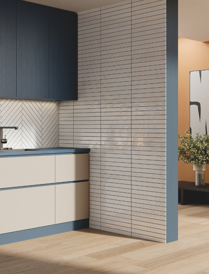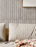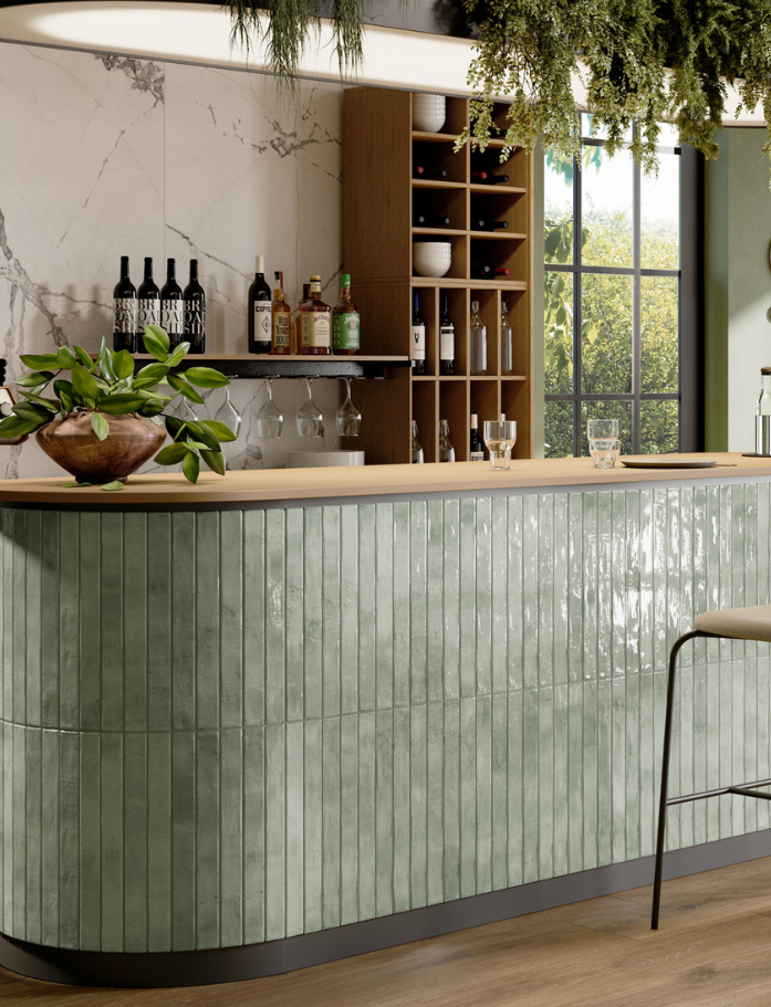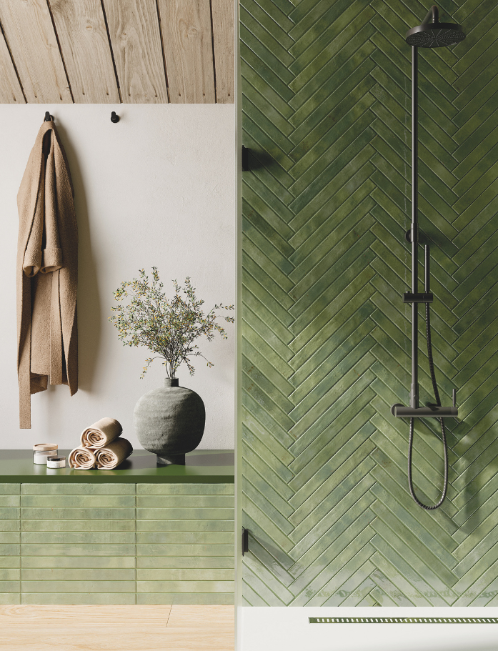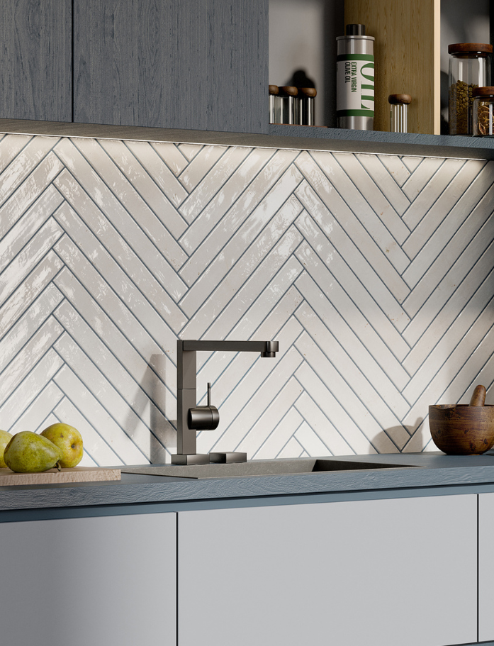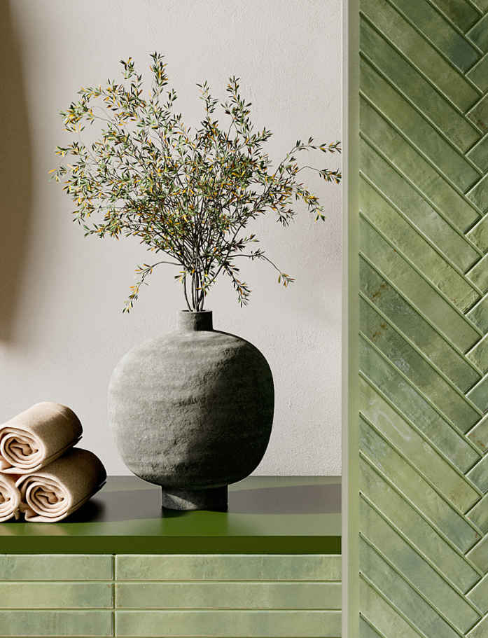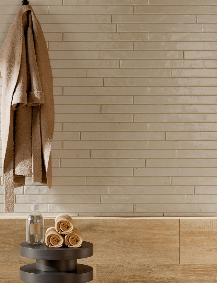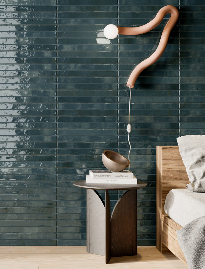 Available in six luminous shades, each tile carries a gentle handmade character with non-rectified edges that enhance its organic appeal. The glossy surface catches the light beautifully, adding depth and dimension throughout the day. Designed for wall applications both internally and externally, it’s perfect for creating brick-inspired layouts with a refined twist. The elongated format allows for classic stack bonds, offsets or playful patterns.