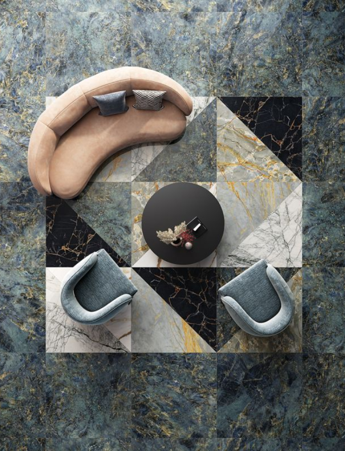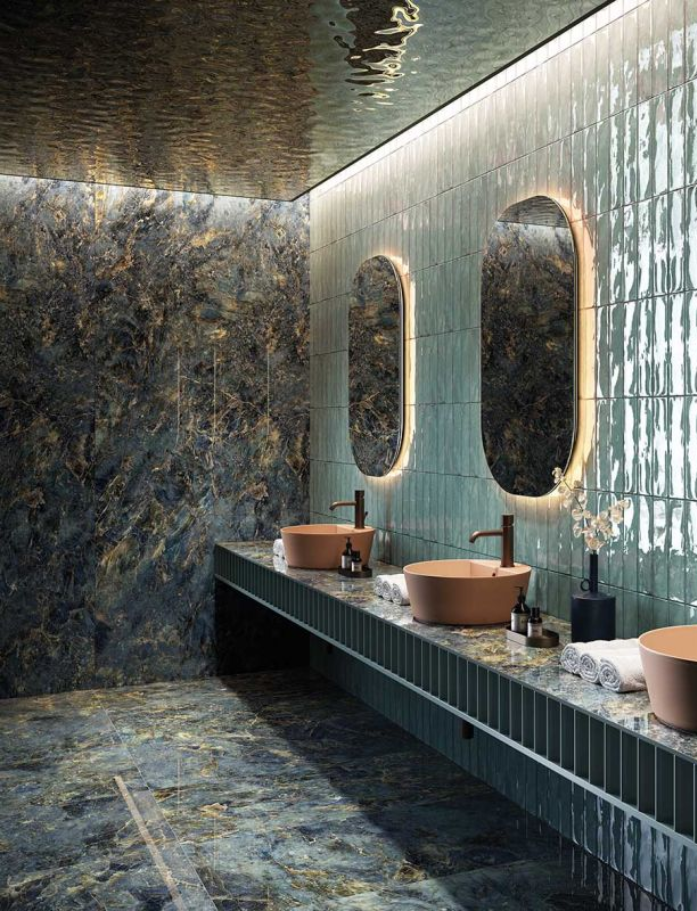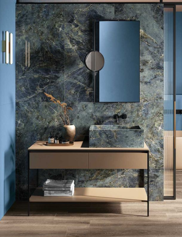 Sensi Signoria Labradorite - Luxe Italian made dark marble look porcelain tile with mystical labradorite stone character and iridescent depth. Gloss finish in a large formats for dramatic high-end design. Available at our InStyle Ceramics Store in Myaree, Perth. Perfect for bold luxury interiors, statement floors & captivating marble aesthetics.