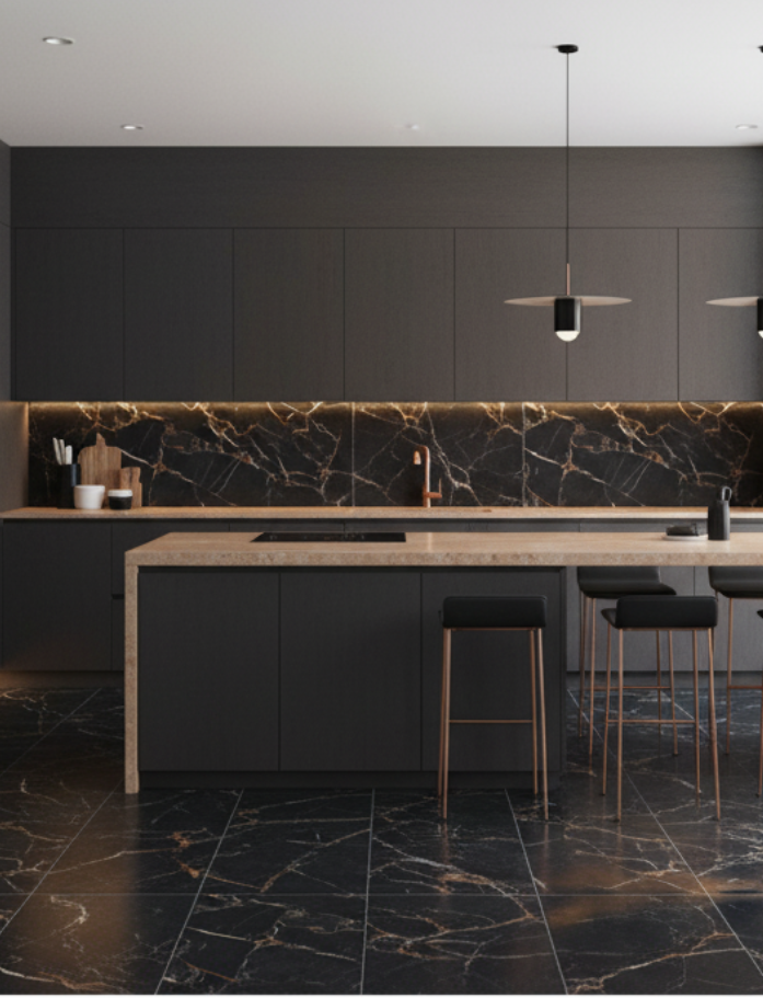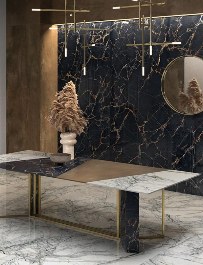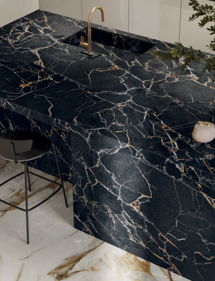 Sensi Signoria Port Gold - Luxe Italian made dark grey marble look porcelain tile with matte or gloss finish in two large formats. High-end sophistication for dramatic premium interiors. Available at our InStyle Ceramics Store in Myaree, Perth. Perfect for bold luxury floors, statement feature walls & contemporary dark marble design.