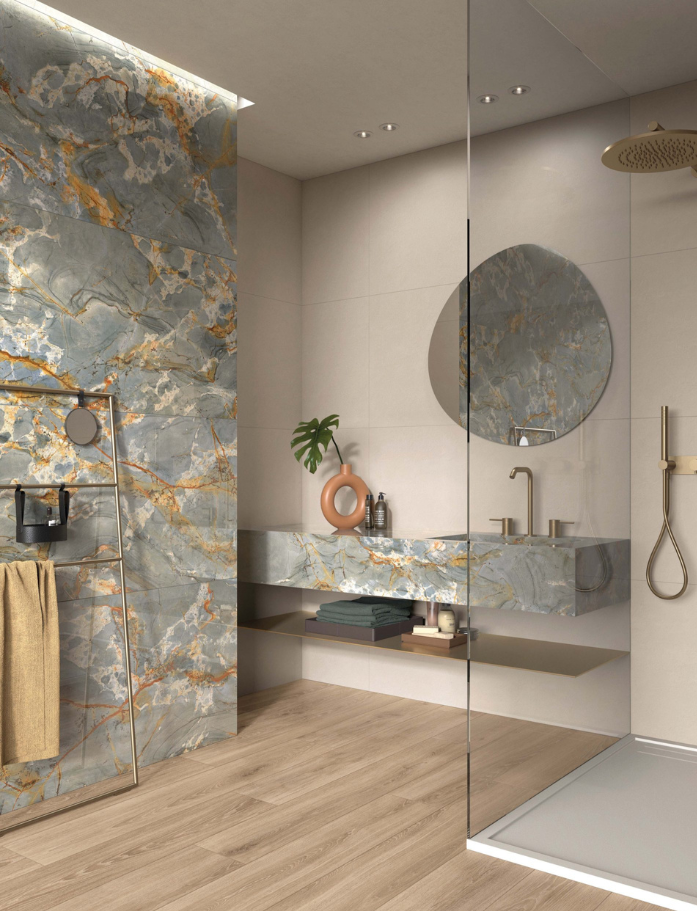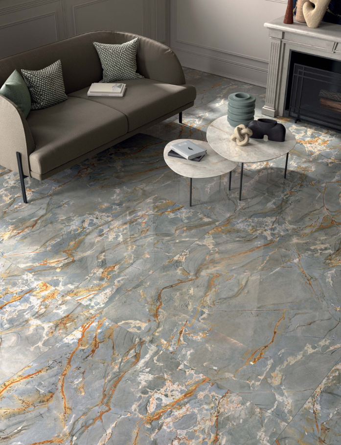 Sensi Signoria Roma Imperiale - Contemporary celebration of Renaissance luxury in grand greyish blues and amber tones. Italian made porcelain tile with rectified edges in 1200x1200mm and 600x1200mm formats. Geometric elegance meets refined marble look contrasts. Available at our InStyle Ceramics Store in Myaree, Perth. Perfect for opulent interiors, statement floors & Renaissance-inspired luxury design.