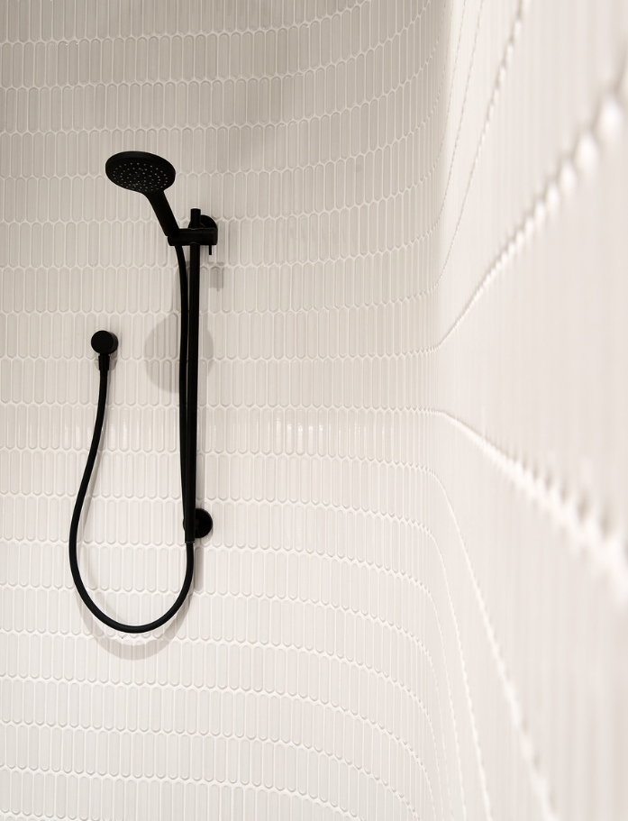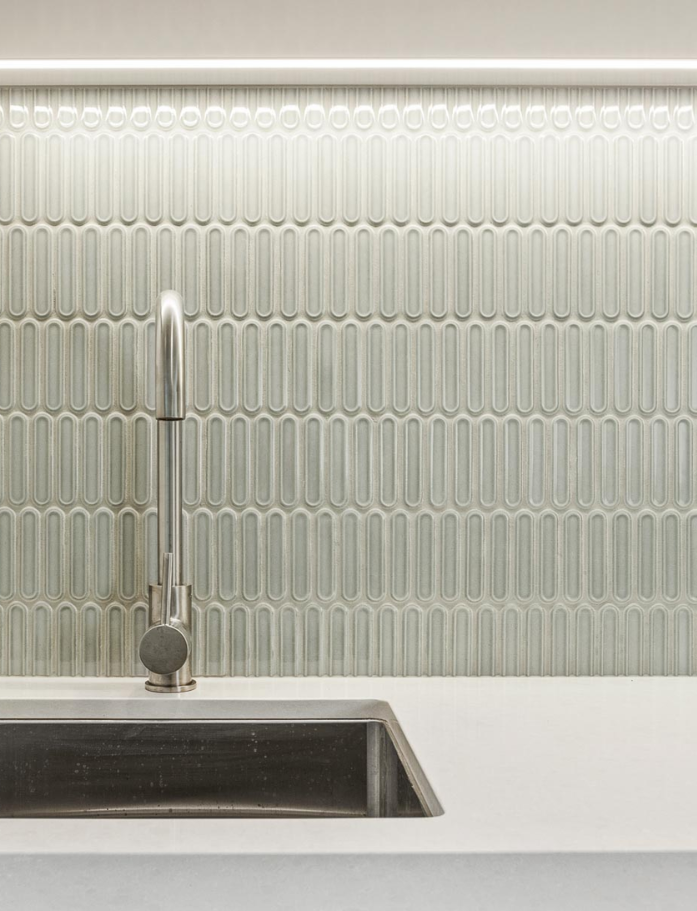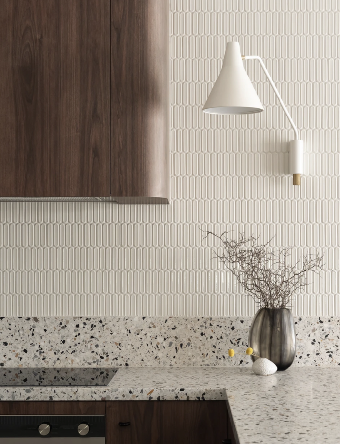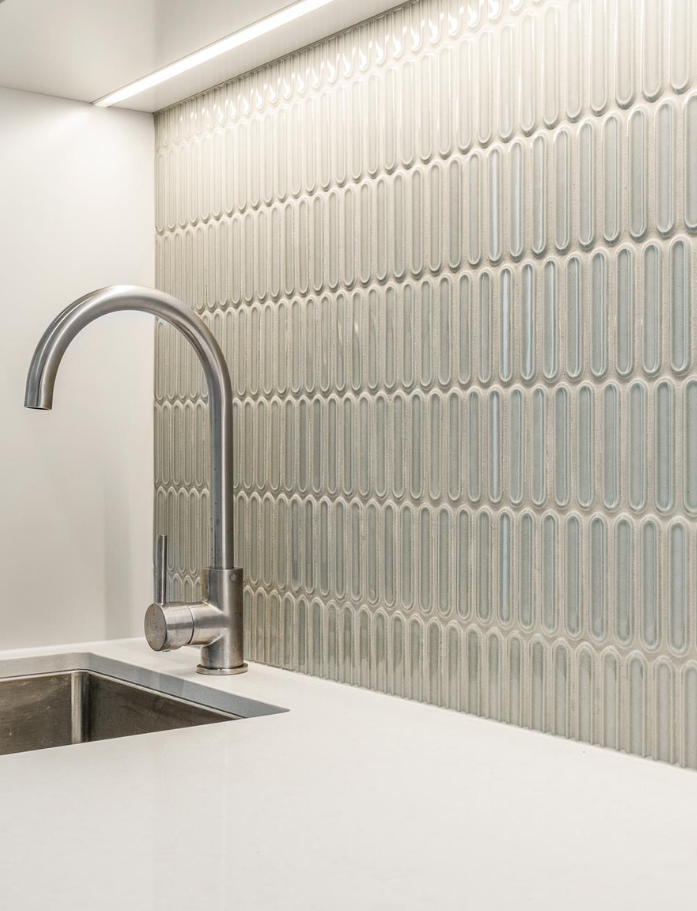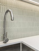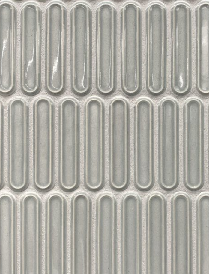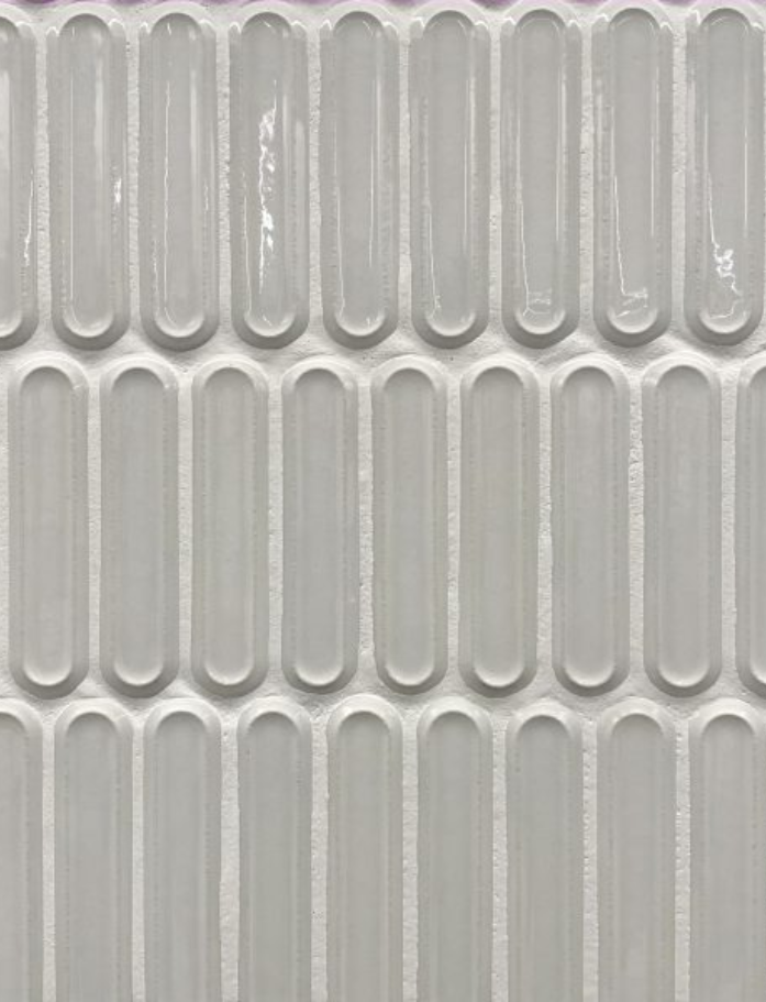 Aria Tiles - Art Deco inspired kitkat mosaic with curved, grooved fingers. Glazed ceramic tile with satin finish and non-rectified edges. Available in 4 colours on 285x300mm sheets. Small format suits curved edges. Available at our InStyle Ceramics Store in Myaree, Perth. Perfect for Art Deco feature walls, curved surfaces & vintage-inspired design.