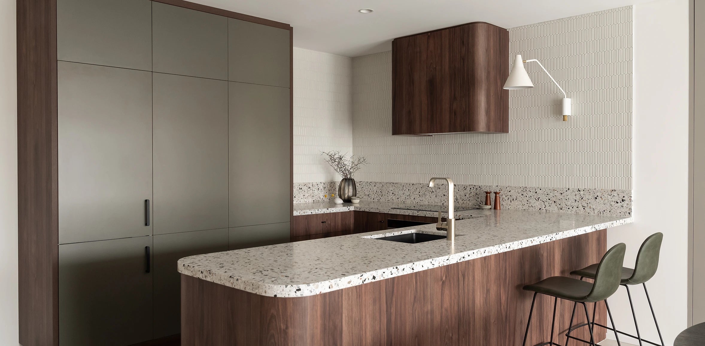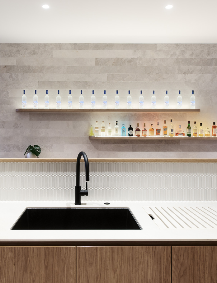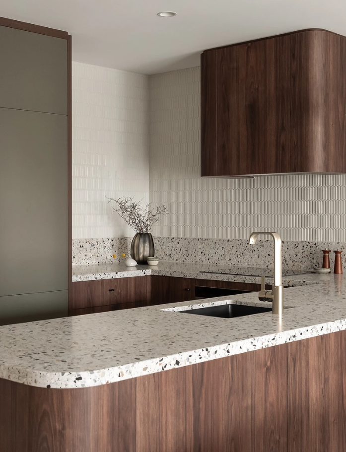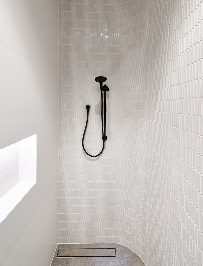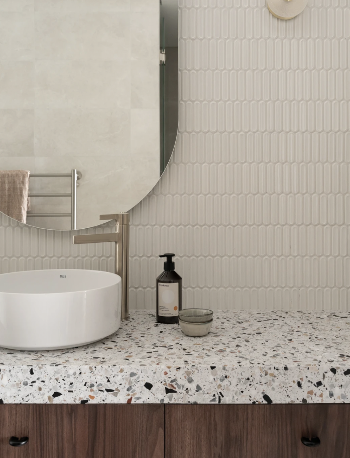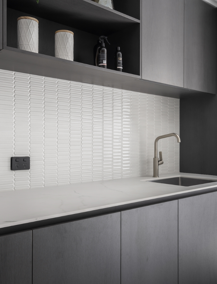Aria Tiles - Art Deco inspired kitkat mosaic with curved, grooved fingers. Glazed ceramic tile with satin finish and non-rectified edges. Available in 4 colours on 285x300mm sheets. Small format suits curved edges. Available at our InStyle Ceramics Store in Myaree, Perth. Perfect for Art Deco feature walls, curved surfaces & vintage-inspired design.