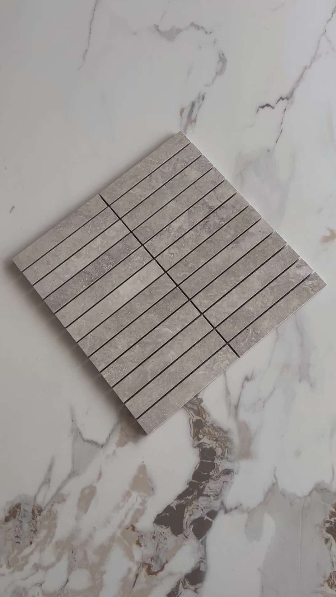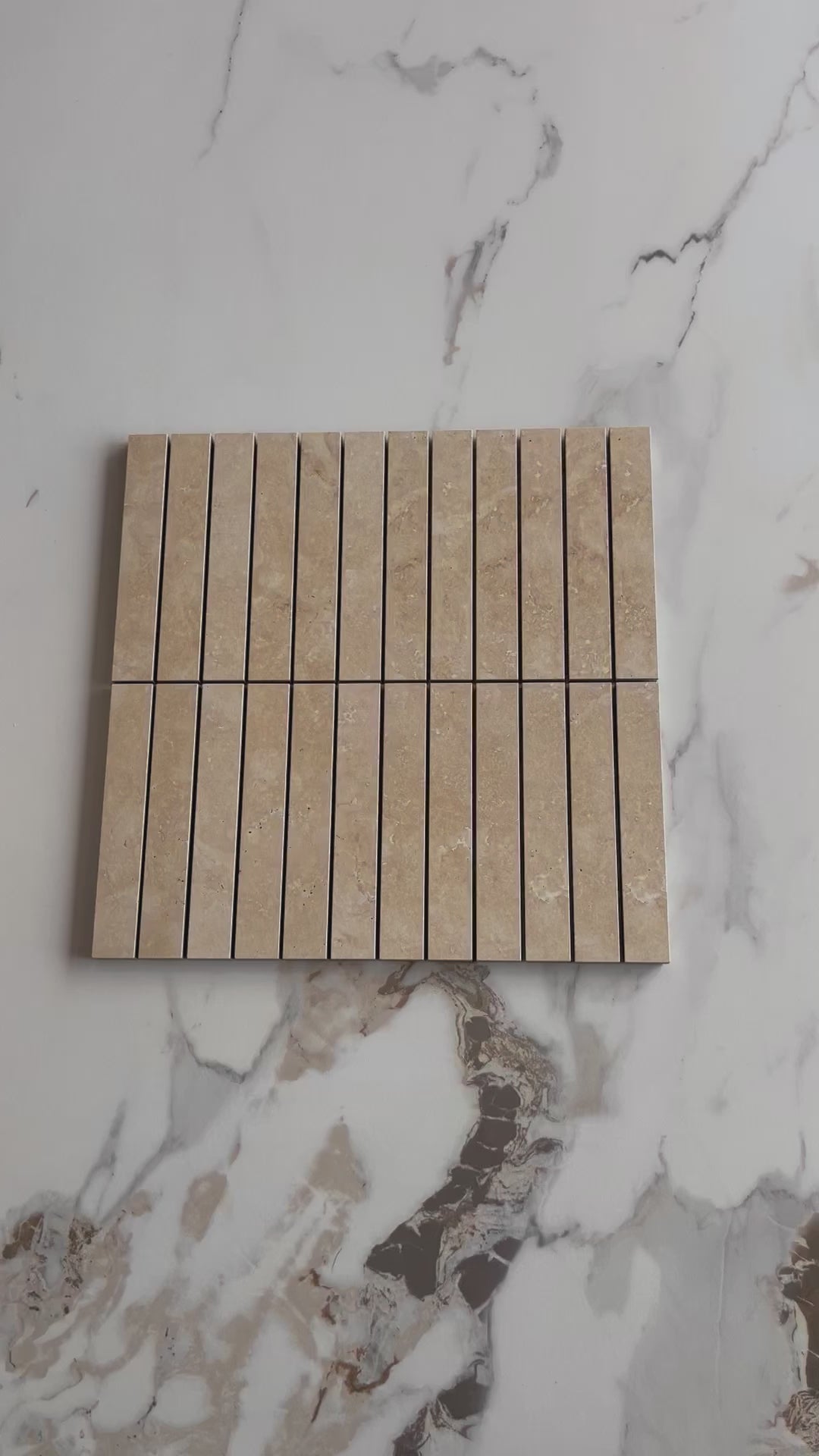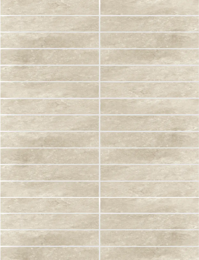 Vent Mosaic Tiles - Natural stone look porcelain kitkat mosaic sheets with matte finish and rectified edges in 3 warm neutral tones. Indoor & outdoor walls with textured detail. Available at our InStyle Ceramics Store in Myaree, Perth. Perfect for feature walls, shower niches & linear stone accents.