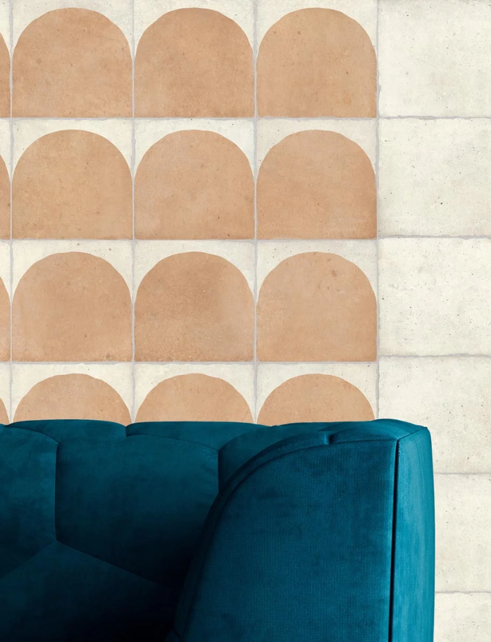 Atlas Collection - Inspired by Sahara dunes, this beautifully handcrafted 150x150mm square glazed porcelain tile features white and terracotta bases with decor tiles in white, cotto, green and khaki. Mix of matte and gloss finishes adds dimension without overwhelming the space. Available at our InStyle Ceramics Store in Myaree, Perth. Perfect for desert-inspired interiors, textured feature walls & earthy dimensional design.
