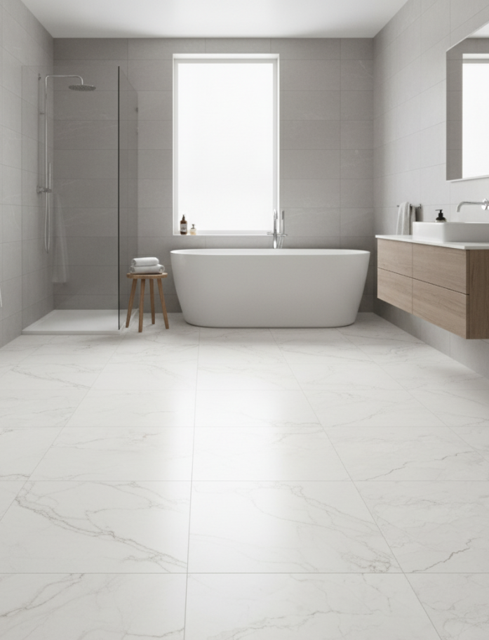 Kimberley Tiles - Beautiful stone look glazed porcelain tile with matte finish and clean rectified edges in 2 soft shades and 2 sizes. Elegant simplicity for refined interiors. Available at our InStyle Ceramics Store in Myaree, Perth. Perfect for serene bathrooms, contemporary living areas & understated stone design.
