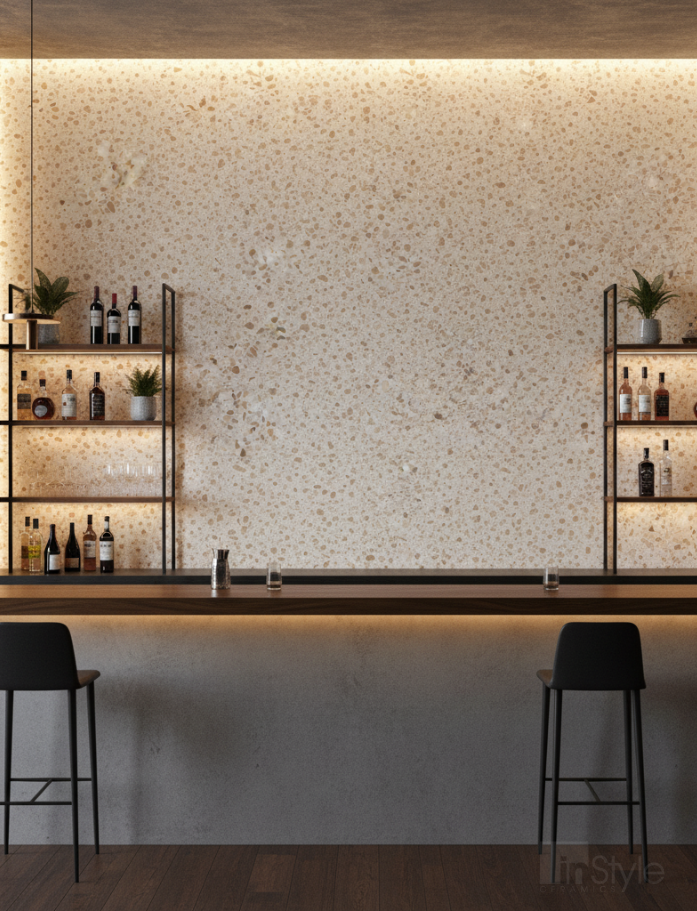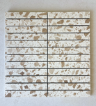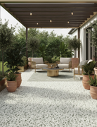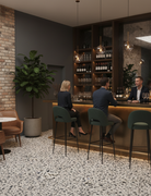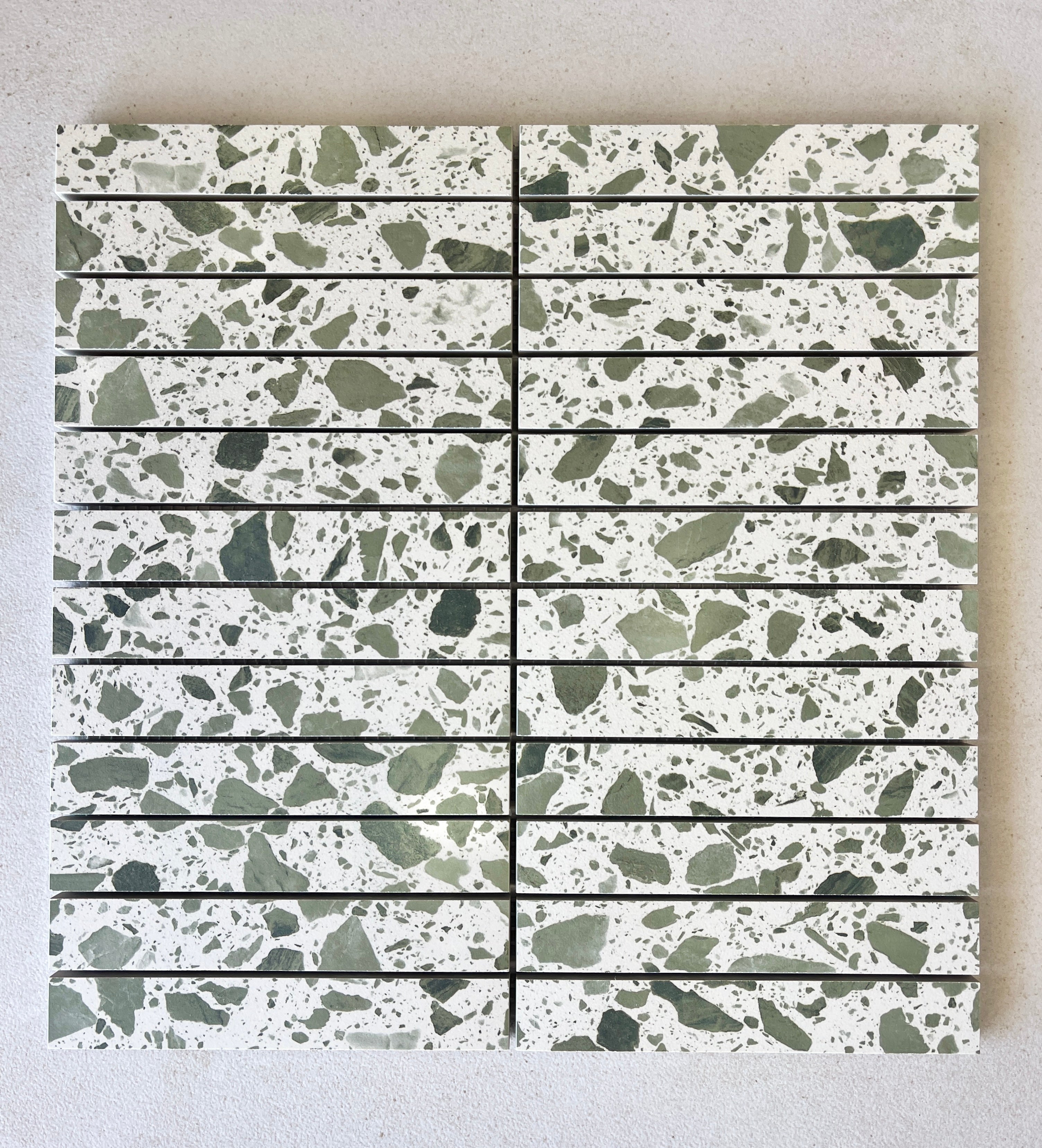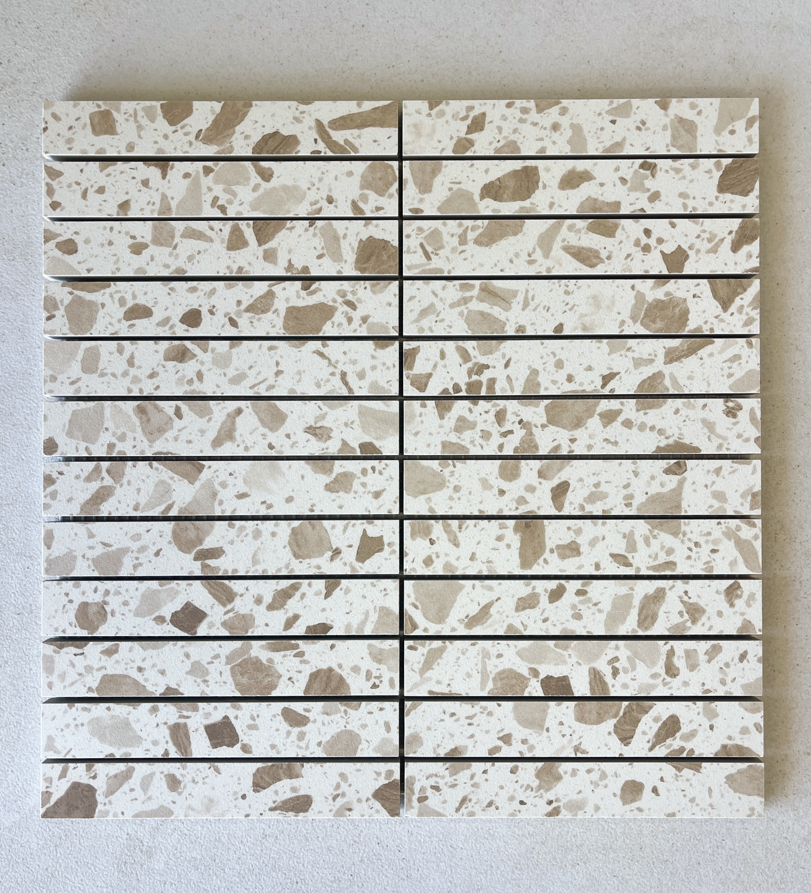 Elara Tiles - Busy terrazzo look, glazed porcelain tile with matte finish and clean rectified edges. Available in Ash, Caramel and Jade in 3 formats: 600x600mm, 300x600mm and 293x293mm finger mosaic sheets. Available at our InStyle Ceramics Store in Myaree, Perth. Perfect for bold terrazzo design, coordinated layouts & statement terrazzo aesthetics.