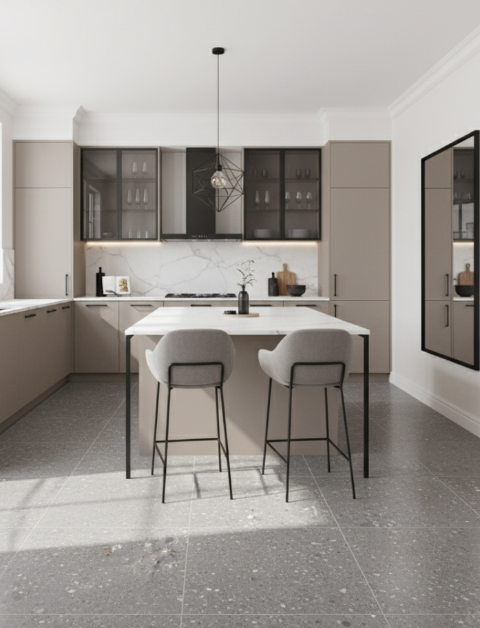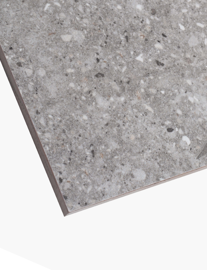Velto Tiles - Neutral terrazzo look porcelain tile with rectified edges in 3 colours and 2 sizes. Playful yet refined terrazzo for internal walls & floors. Available at our InStyle Ceramics Store in Myaree, Perth. Perfect for balanced interiors, feature floors & contemporary terrazzo design.