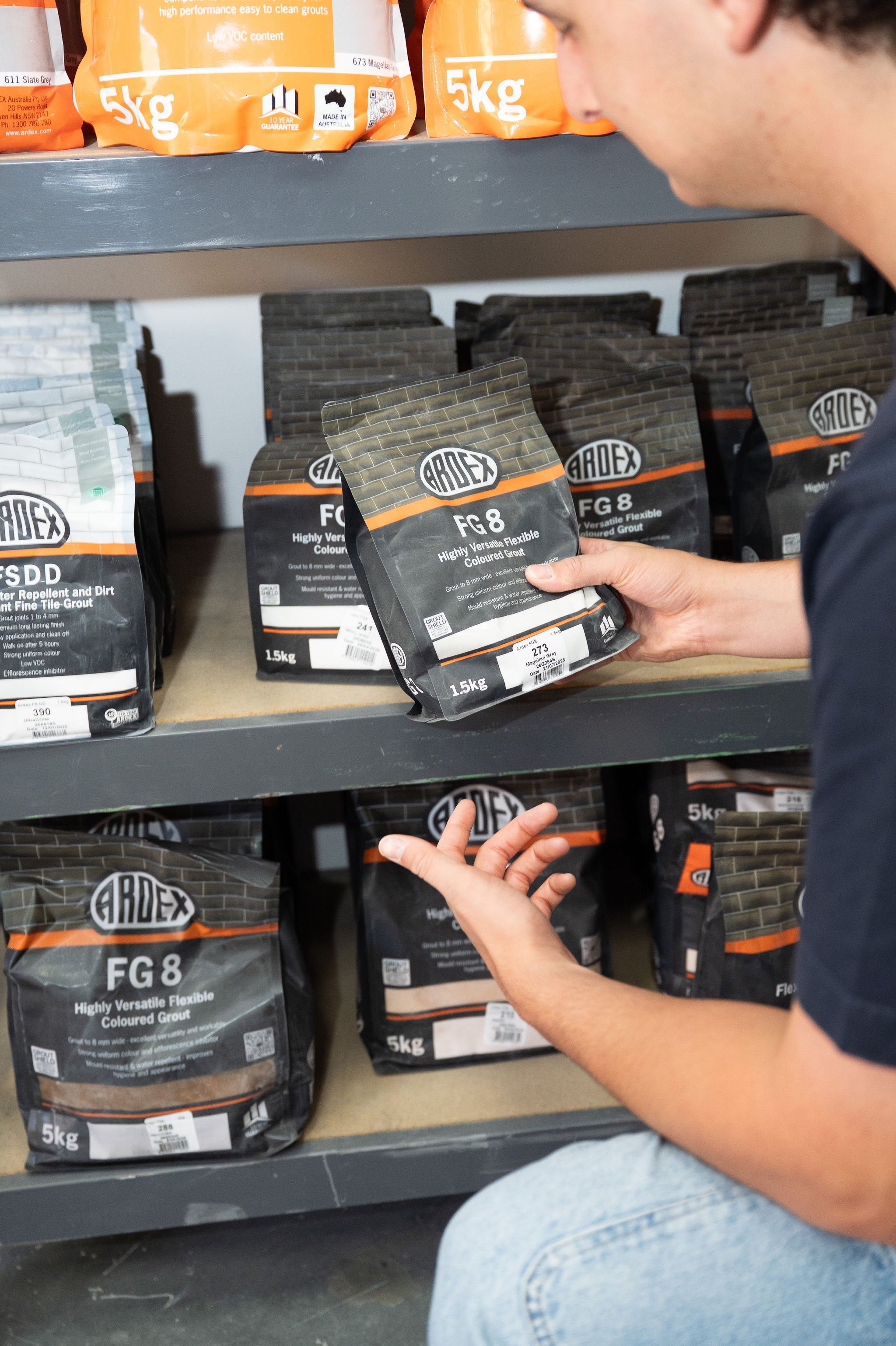At the back of our Myaree showroom, we stock everything tilers and builders need: adhesives, grouts, trims, sealants, levelling systems – the works.