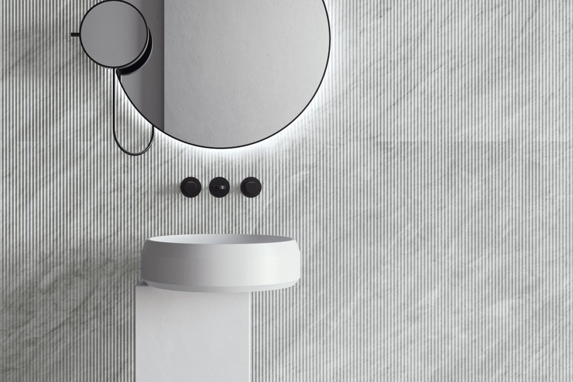 Lia Range - Elegant marble look tiles in ivory & silver with fluted texture and silk finishes. Timeless beauty inspired by natural stone where sky, rock and sea meet. Available at our InStyle Ceramics Store in Myaree, Perth. Perfect for luxury interiors & contemporary marble aesthetics.