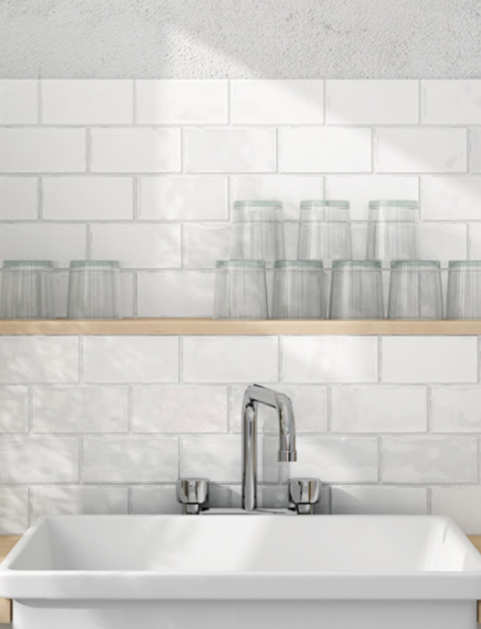 Siena Tiles - Handmade subway tile (75x150mm) with glossy finish and non-rectified edges. Inviting, earthy quality in 3 beautiful colours: White, Sky and Green. Available at our InStyle Ceramics Store in Myaree, Perth. Perfect for artisan feature walls, earthy splashbacks & organic subway design.